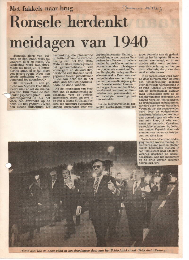 Ter herinnering aan de 25ste verjaring van de Slag van Ronsele, wordt op 9/05/1965 een herdenkingssteen ingehuldigd te Ronsele aan de brug van Stoktevijver, met als bronzen opschrift “Hier boden in mei 1940 de 2de en 22ste Linieregimenten heldhaftig weerstand aan de Duitse legers”. De plaat werd onthuld door Luitenant-Generaal De Wulf, divisie bevelhebber in 1940 en ingezegend door Z.E.H Kanunnik Loontjes, oud aalmoezenier van het 22ste Linie en vertegenwoordiger van Z.H.E. Bisschop van Gent.